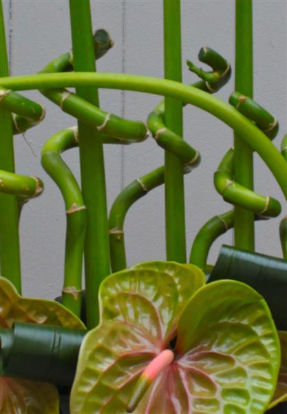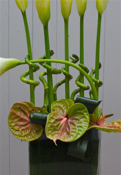 Simplicity itself, clean lines and two colours. This arrangement was inspired by a trip to New York and the contemporary floristry in the Big Apple. Arum lilies, anthuriums, bamboo and aspidistra leaves are used to create this statement piece.