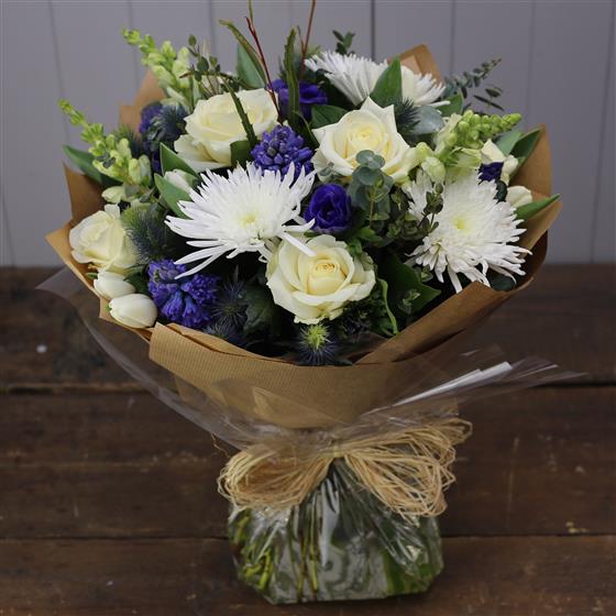 A beautiful seasonal selection of blue and white flowers complimented with lush, seasonal foliage.