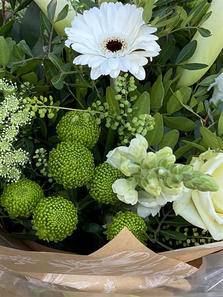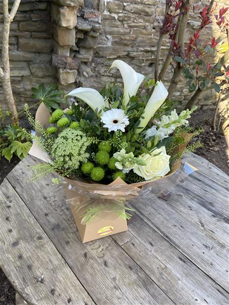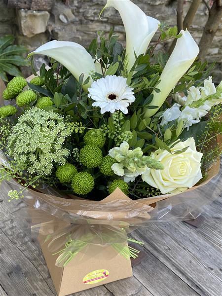 A stunning modern bouquet featuring large calla lilies and other seasonal flowers in white & green.