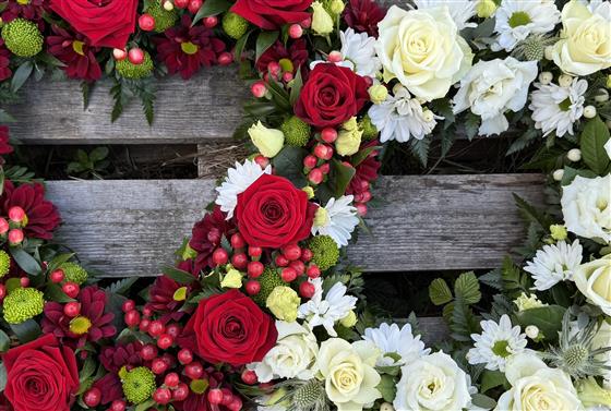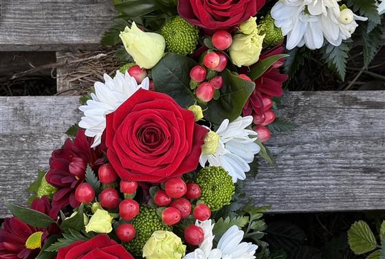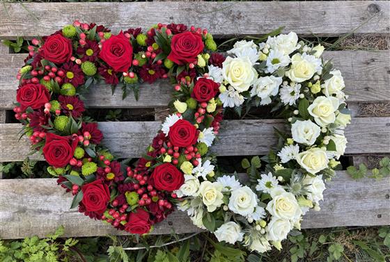 A stunning double open heart - this design includes roses with other complimentary seasonal flowers in the colourway of your choice.