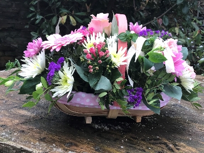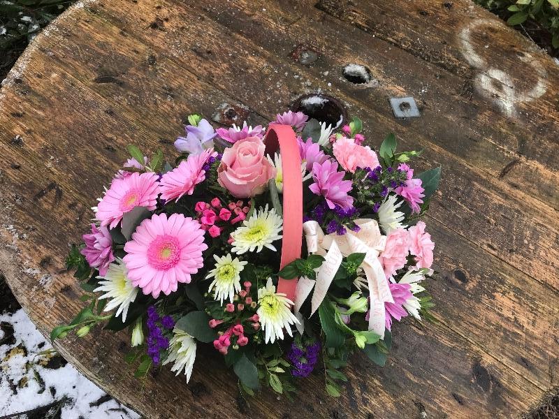 A beautiful basket arrangement of seasonal flowers in traditional Mother's Day colours.