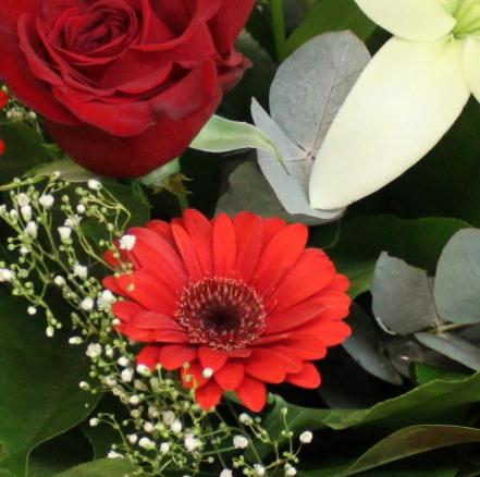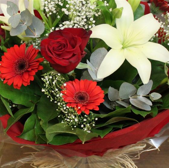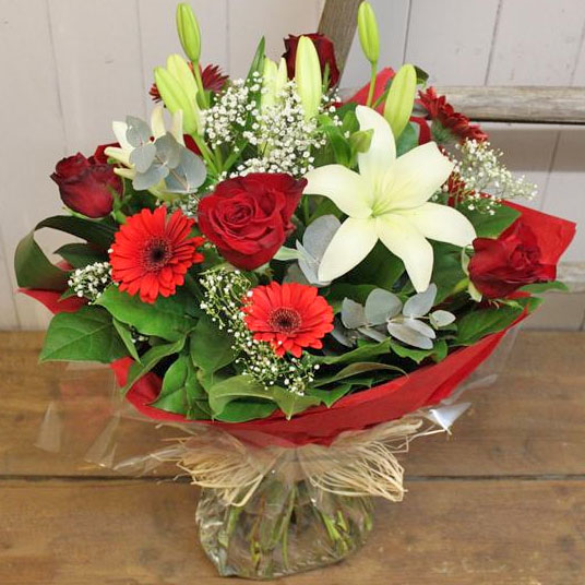 Red roses, white lilies, red germini and gypsophila hand tied and delivered in a water bubble.
