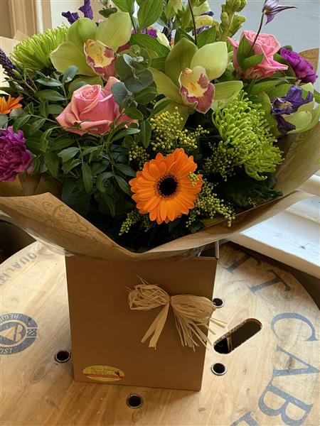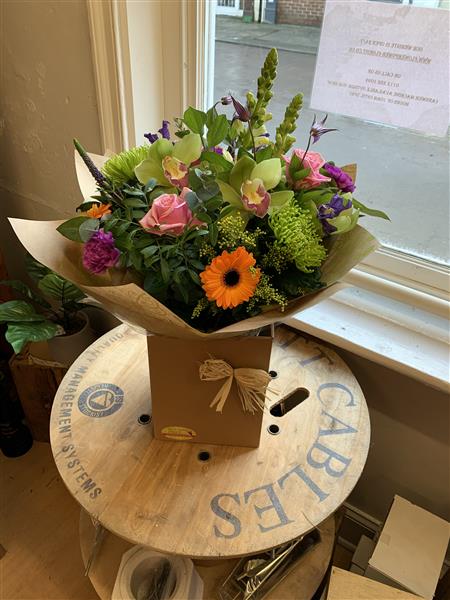 A beautiful handtied bouquet of bright seasonal flowers complimented with orchid heads. The flowers chosen by our expert florists may differ from the image but will include orchid heads.