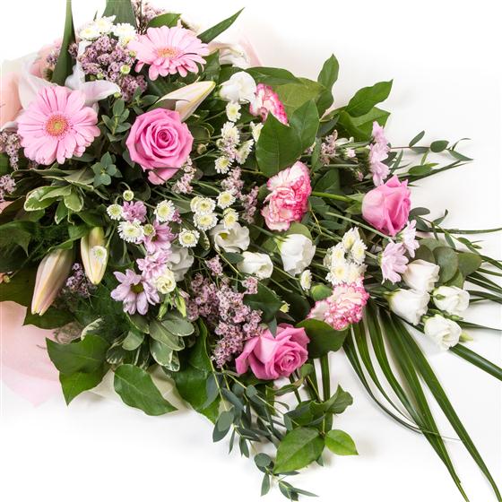 A traditional open sheaf tribute in seasonal white and pink flowers with complimentary foliage.