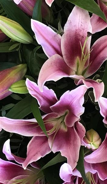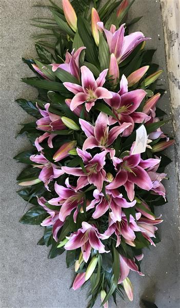 A stunning casket spray of beautiful, scented pink oriental lilies with complimentary foliage.