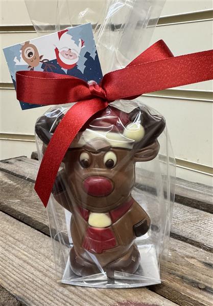 A gorgeous chocolate gift in the shape of a novelty elk. Sealed in a clear bag and finished with a red ribbon bow.