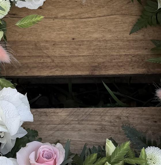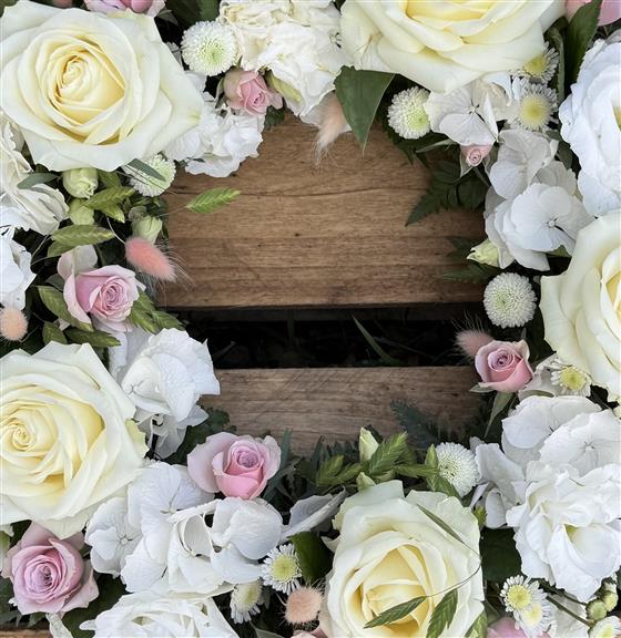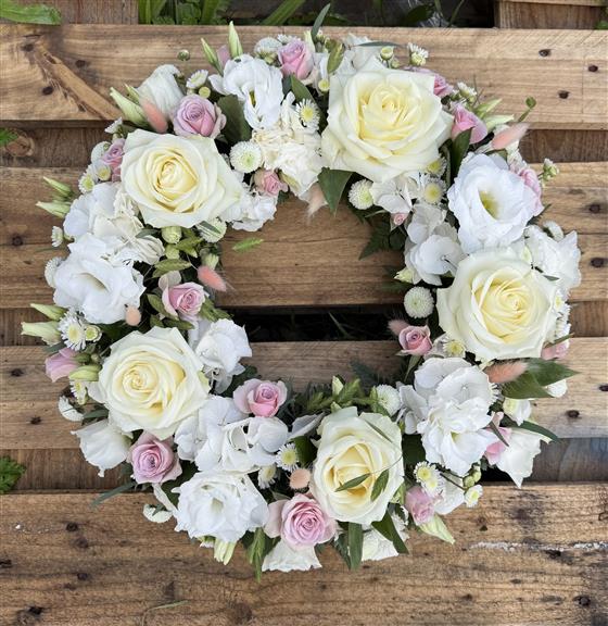A stunning wreath of beautiful opulent white flowers with a delicate hint of pink running throughout the design.